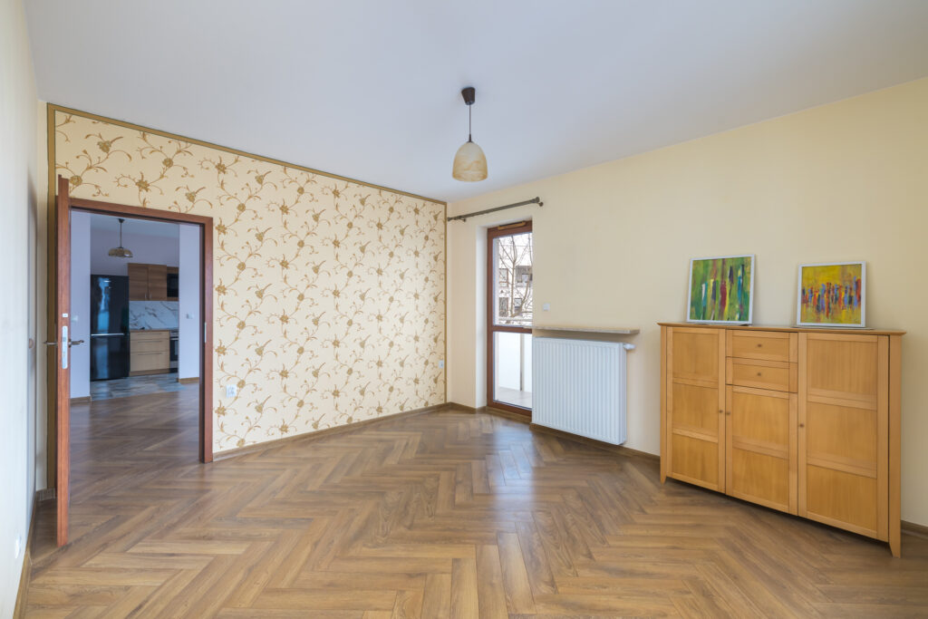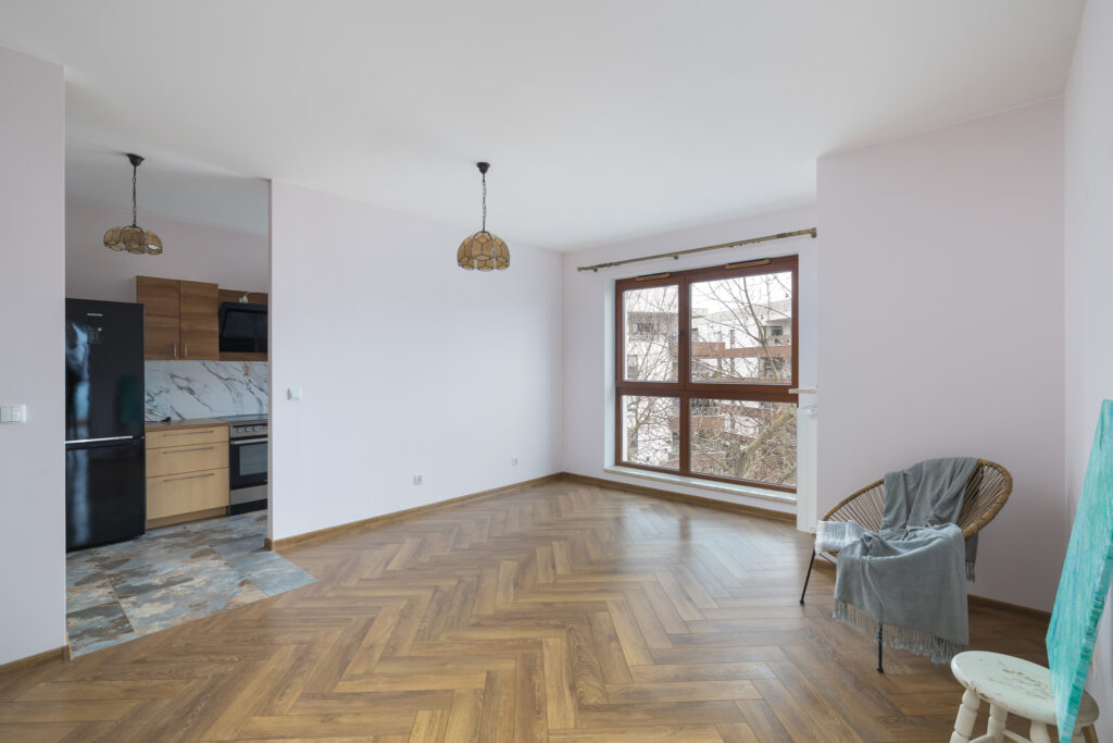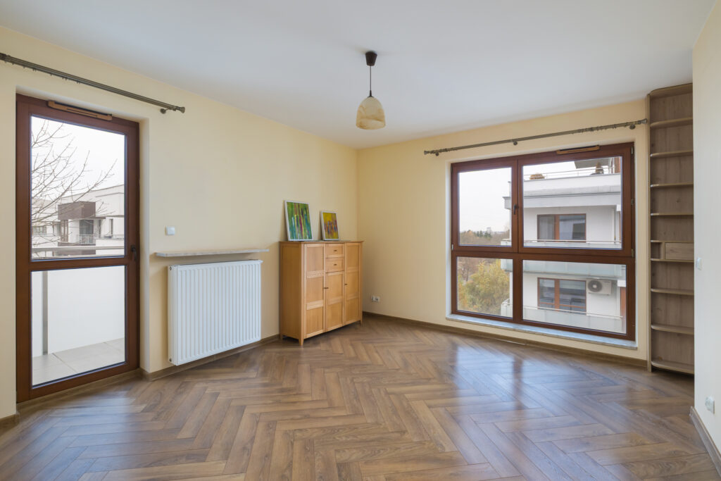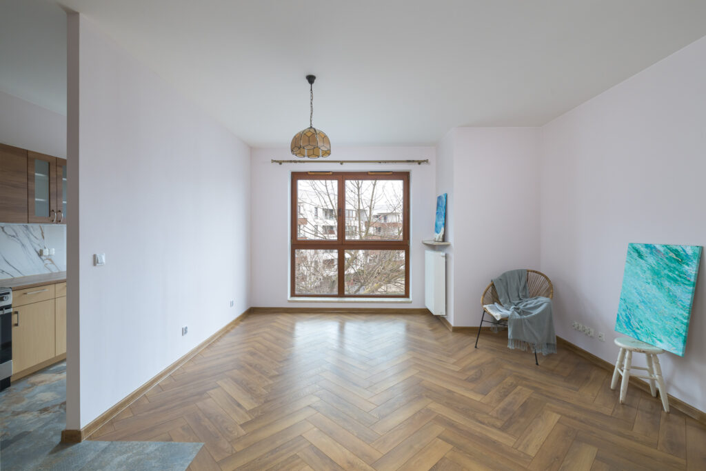 Mieszkanie jest w stanie do wejścia, wykończone wysokiej jakości materiałami. Na podłodze piękny drewniany parkiet ułożony w jodełkę, duże drewniane okna, kamienne parapety. Za oknem w salonie znajduje się drzewo, które latem i jesienią cieszy oko pięknymi, żywymi kolorami.