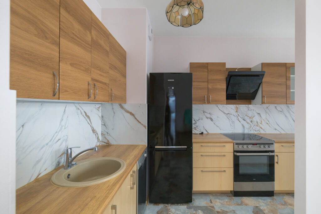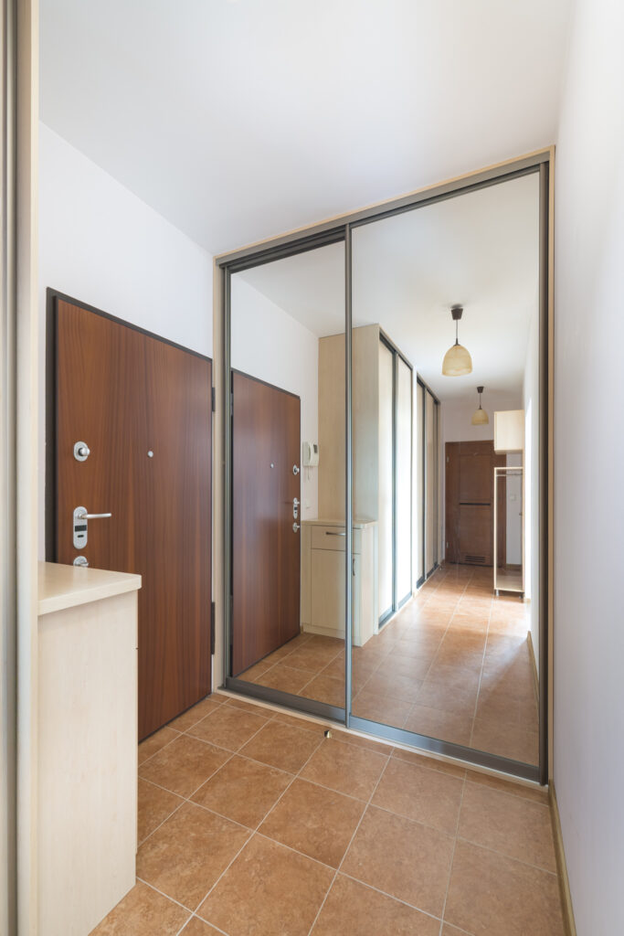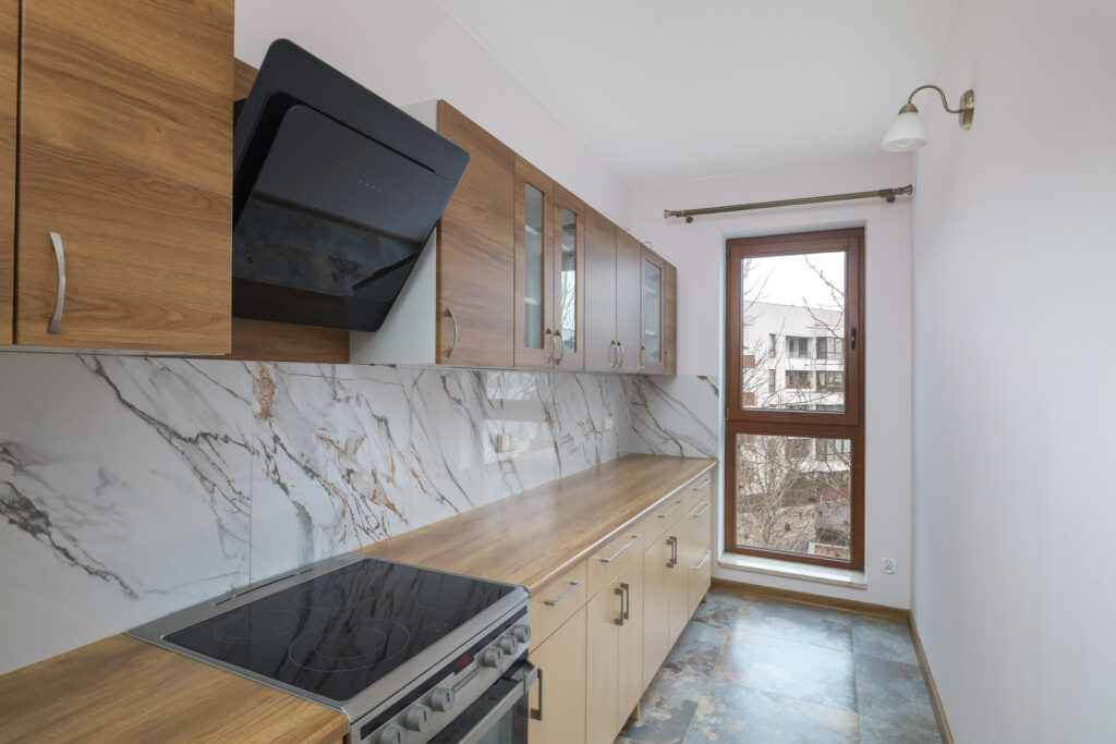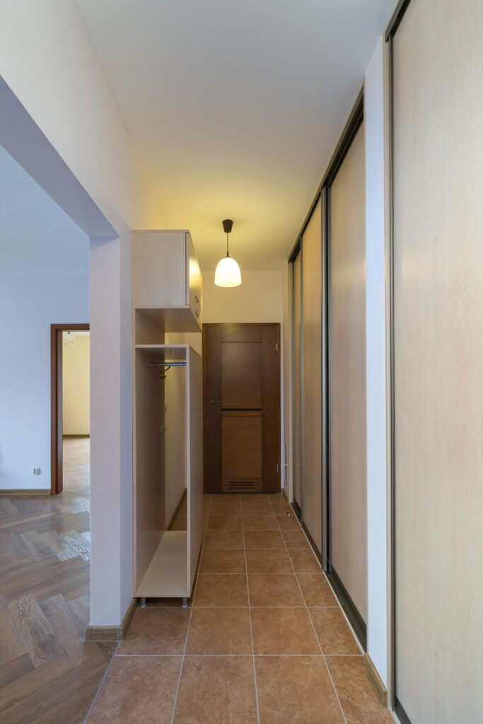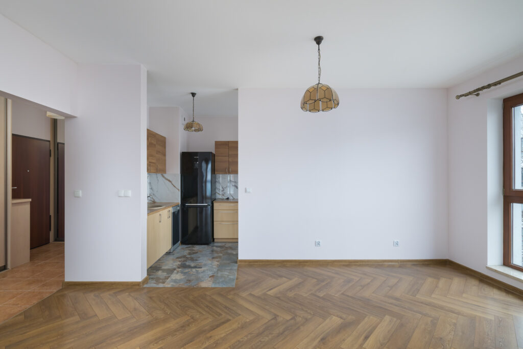 Mieszkanie jest w stanie do wejścia, wykończone wysokiej jakości materiałami. Na podłodze piękny drewniany parkiet ułożony w jodełkę, duże drewniane okna, kamienne parapety. Za oknem w salonie znajduje się drzewo, które latem i jesienią cieszy oko pięknymi, żywymi kolorami.